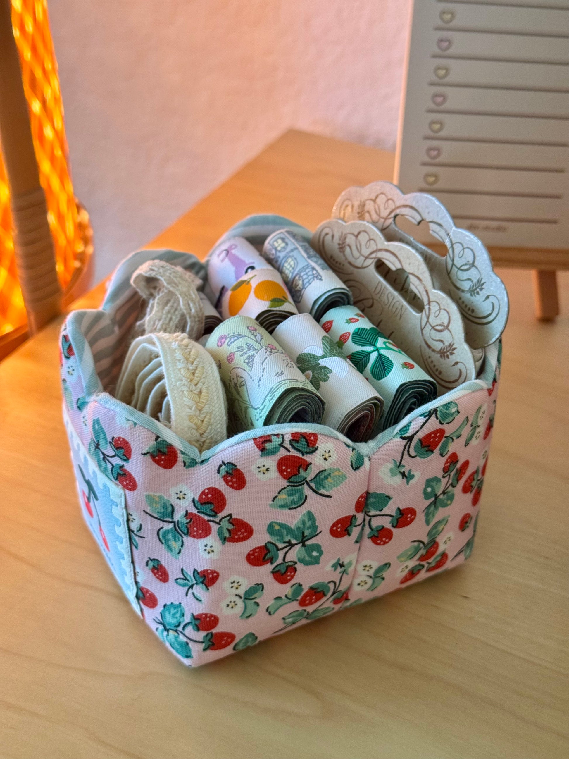 A small, handmade basket that is perfect for storing anything from ribbons, to scrunchies, to hygiene products or miscellaneous desk items.